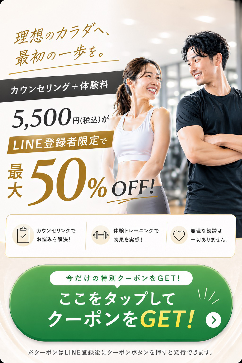 1人じゃないからこそ目標に向けて 最短で達成できるように 徹底サポートさせていただきます。 人目を気にせずトレーニングができるからこそ 集中して取り組むことができます。